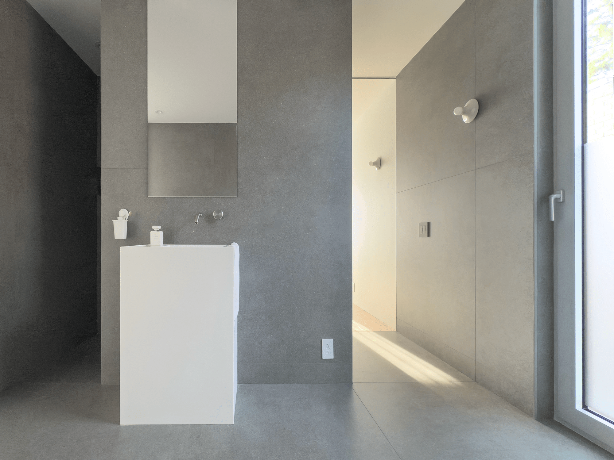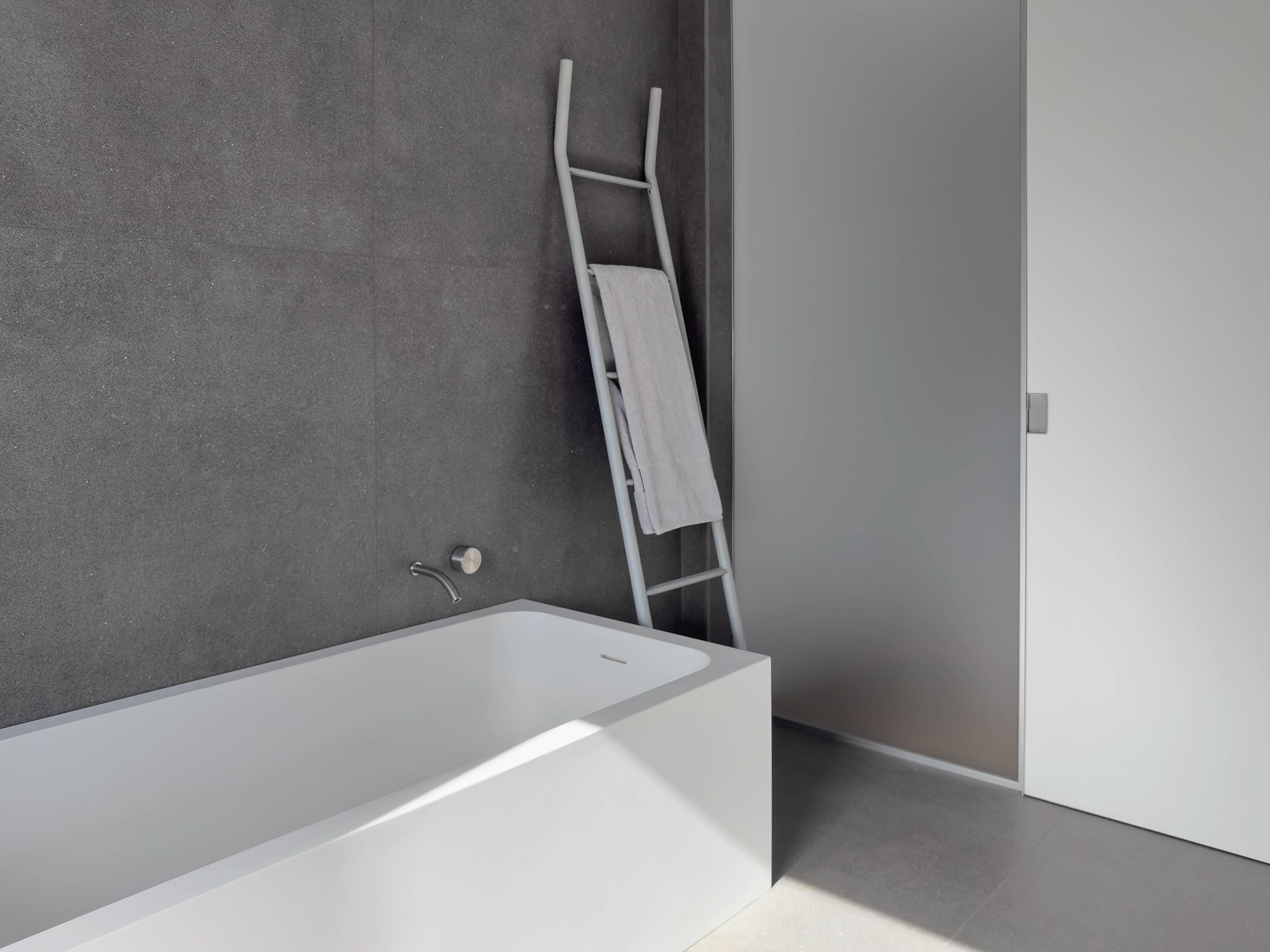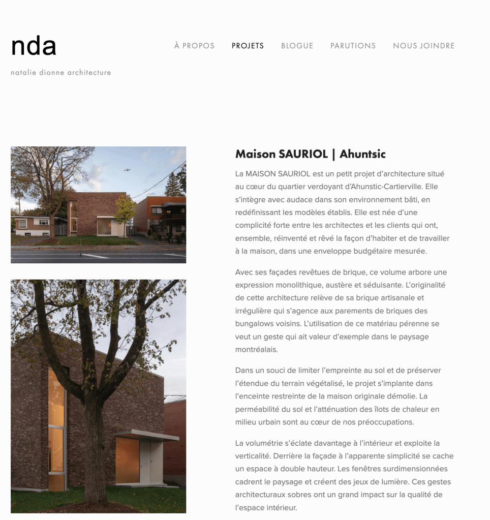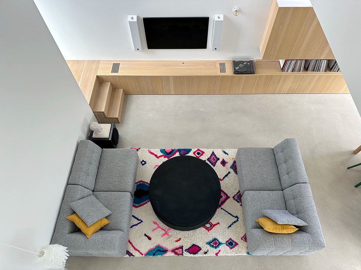 « La volumétrie s’éclate davantage à l’intérieur et exploite la verticalité. Derrière la façade à l’apparente simplicité se cache un espace à double hauteur. Les fenêtres surdimensionnées cadrent le paysage et créent des jeux de lumière. Ces gestes architecturaux sobres ont un grand impact sur la qualité de l’espace intérieur. »